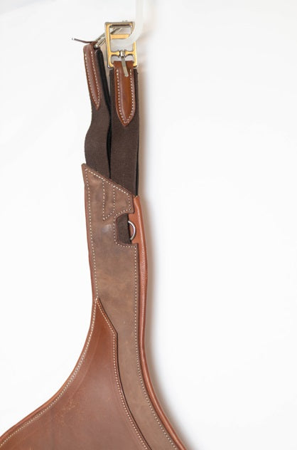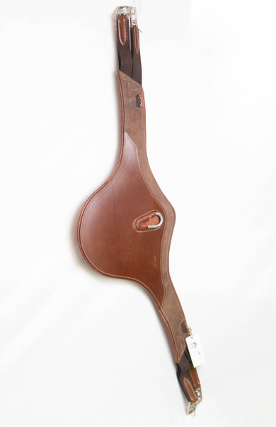 This girth was a sample that did not get the Barnes Tack Room logo stamped on it. It is crafted of beautiful Argentina leather with padding throughout the girth. It also features a large clip in the center of the girth for easy martingale attachment.