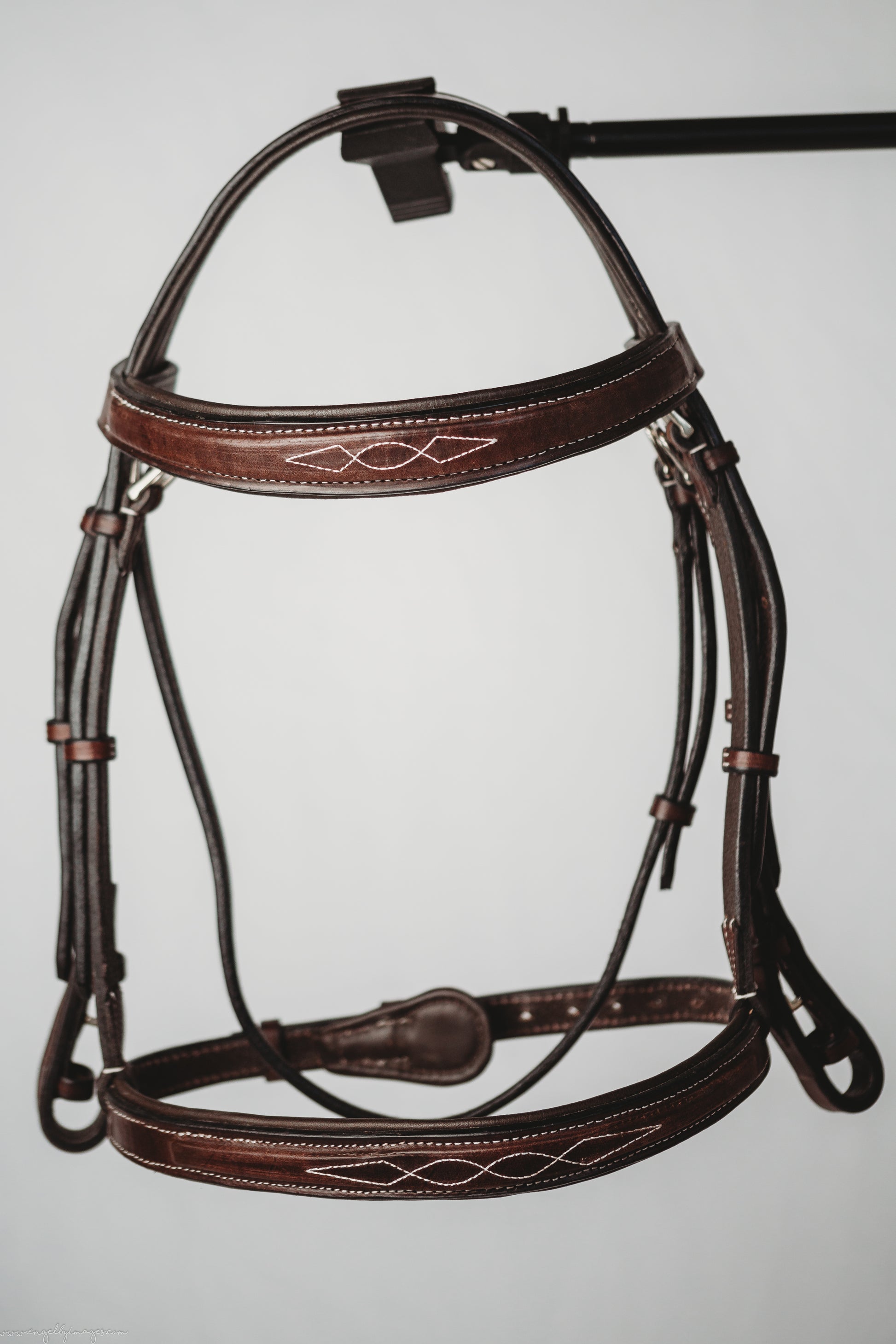 This bridle is made with our Second Series Coffee leather with a 2" wide noseband and browband. Fancy stitching and beautiful dark brown padding.