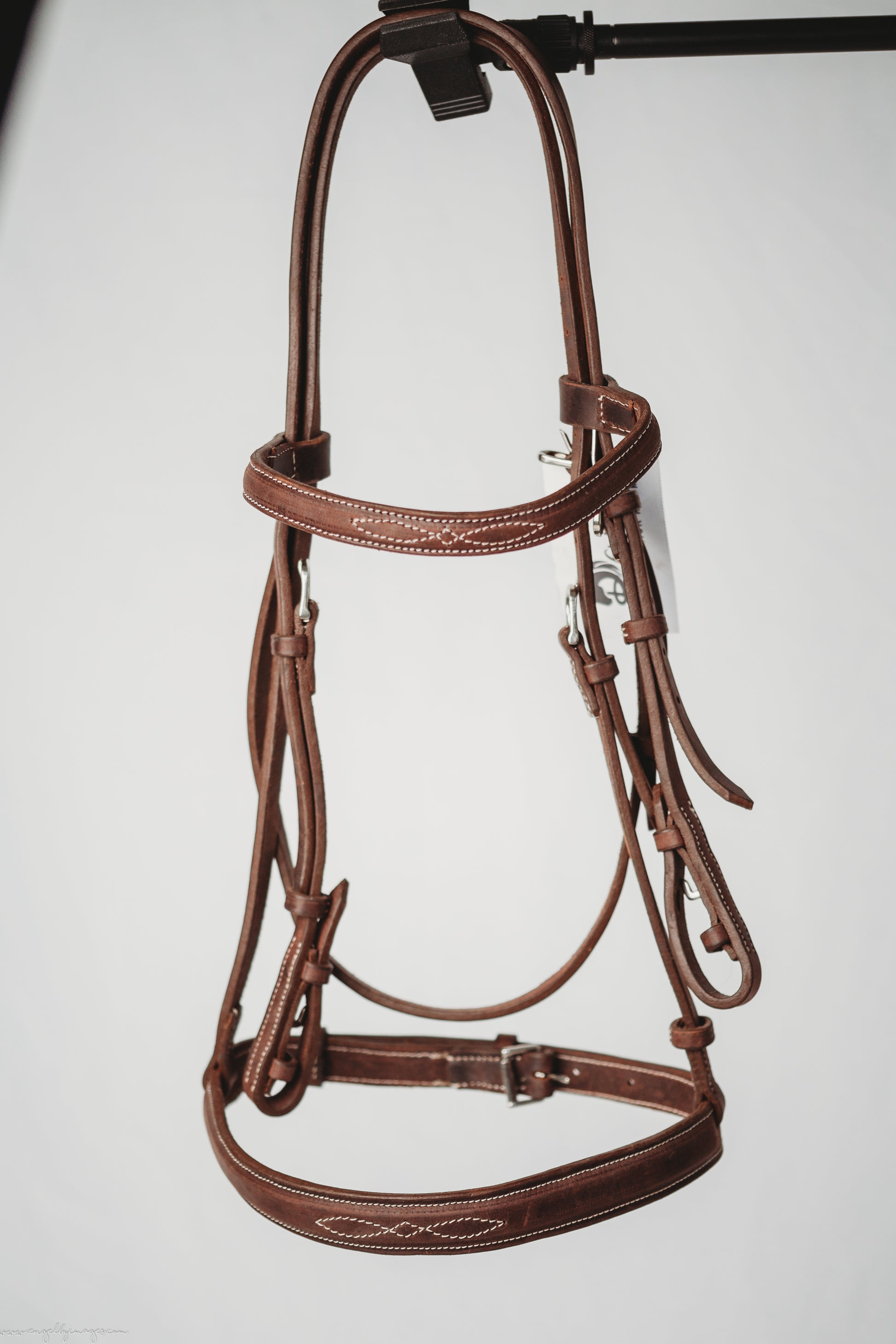 Made from our beautiful Luxe Leather, this bridle is as traditional as they come! Color is oak, Size is Full. Fancy stitching on the noseband and the browband. No padding.